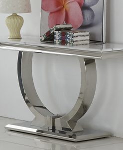 Modernt konsolbord i silvermetall och vit marmorino massa. För dig som gillar design, ställ två tjusiga lampor på och-voilla