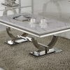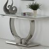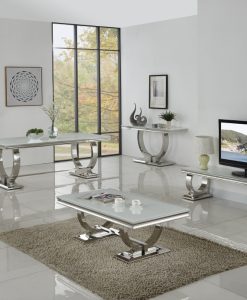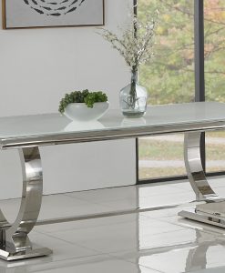 Exklusivt, prisvärt matbord i silvermetall. Med skiva av vit glasskiva. Ligger på benställning i silverpolerad metall i form av halvcirklar. Ser betydligt dyrare ut än det är. Ett verkligt fynd.