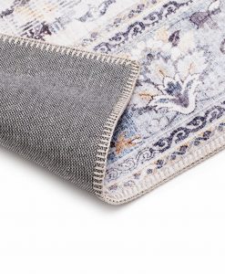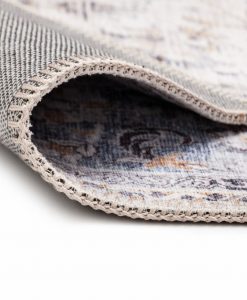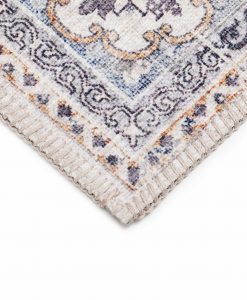 Shiva är en elegant matta som har stilrent mönster med orientalisk inspiration. Mattan har en melerad ljusbeige bottenfärg med tryckt mönster i guldiga och blå toner. Mattans kanter pryds utav en sydd langettering som består av riktiga stygn i ljusbeige ton, vilket ger en exklusiv och lyxig känsla.