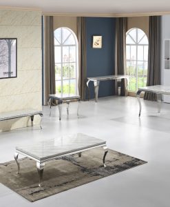 Silver är en modern matbord som är i victoriansk stil, skivan är i ljus marmor. Finns att beställa hörnbord, konsol, soffbord & tv-bänk från samma serie.