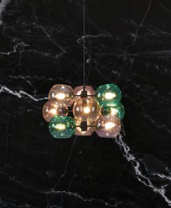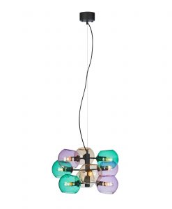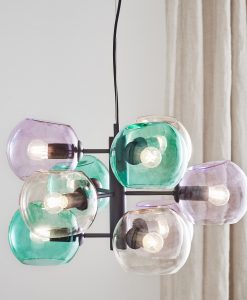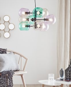 Soap taklampa från Markslöjd. Stomme i metall och kupor av färgat glas. Monteras på takkrok. Jordad anslutning till kopplingsplint eller takkontakt. 9st små lamphållare (E14) för max 40W eller motsvarande i LED, halogen eller lågenergi. 1,5m textilklädd kabel. Ljuskällor ingår ej.
