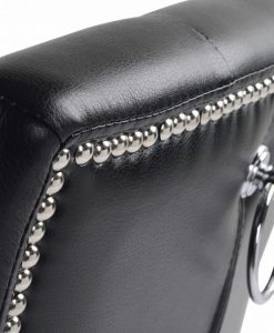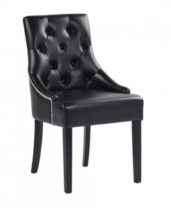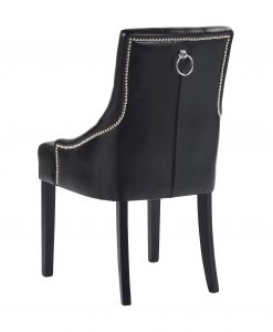 Stol i snyggt konstläder med svarta dekorspik och handtag i form av metallring samt svarta ben. Snygga klädda knappar på stolsryggens framsida ger stolen dess karaktär. Passar bra som solitär eller som matsalsstol till t.e.x. Rowicos vintageinspirerade bord Inez eller Aspen.