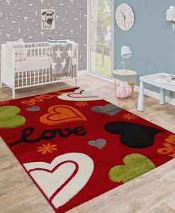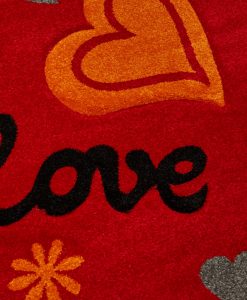 Sweet Love har en röd bottenfärg med matchande langettsöm som löper längs långsidorna. Den har mönster med hjärtan och texten love i olika storlekar och färger såsom grön, grå, svart, organe och vit. Mattan är gjord i carvingteknik, vilket innebär att den har utskärningar för att färger och detaljer skall bli mer framträdande och ge större effekt. Love har en kort skuren lugg och är maskinvävd i polypropylen, vilket är ett syntetmaterial som är lätt att rengöra och hålla fri ifrån ludd och damm.Eftersom den har korta fibrer så tränger inte smuts in lika lätt som på en matta med längre fibrer och den är även resistent mot de flesta fläckar.