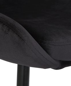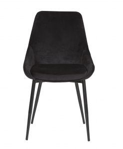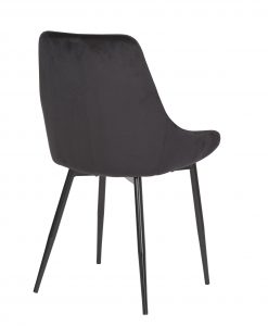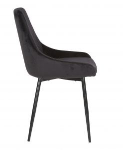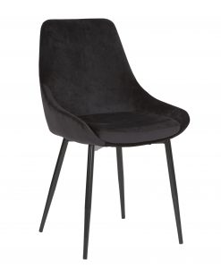 Trendig stol som är klädd sammet tyg, står på ben i svart metall.