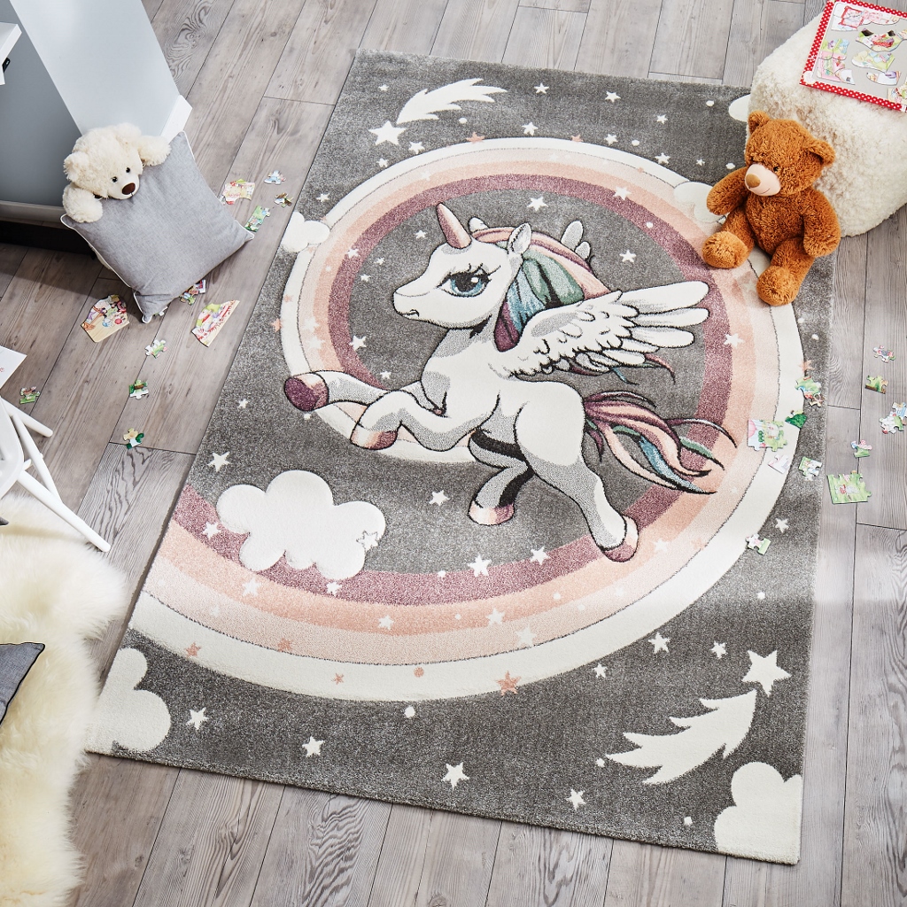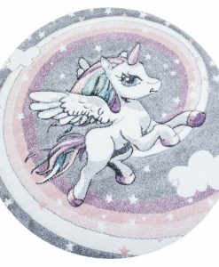 Unicorn är en maskinvävd matta som har grå bottenfärg och matchande langettering. Mattan pryds av en vit enhörning som har vita vingar och pastellfärgad man och svans. Enhörningen omges av vita stjärnor och moln. Atlas Unicorn har en kort skuren lugg i polypropylen, vilket är ett syntetmaterial som är lätt att rengöra och hålla fri ifrån ludd och damm.