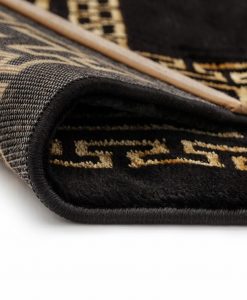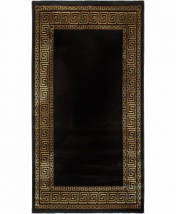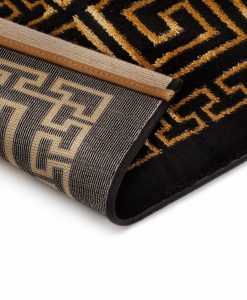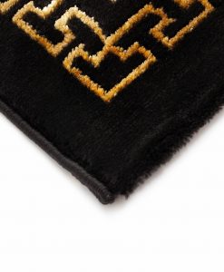 Versace gold är en stilren matta med inspiration ifrån antikens grekiska mönster. Mattan har en svart bottenfärg med matchande langettering på långsidorna och en meanderbård i guldton, som skimrar vackert beroende på hur ljuset faller.