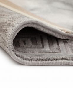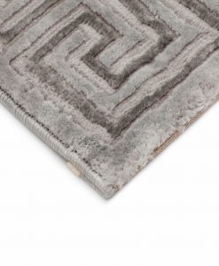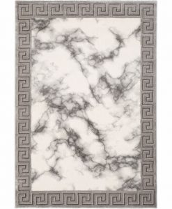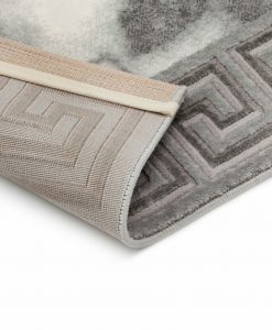 Versace marmor har en grå bottenfärg med matchande langettering på långsidorna. Mattan pryds av flera meanderbårder som består av fram- och tillbakaslingrande flätningar i gråa toner. Eftersom mönstret är gjort med High/low effekt så blir färgerna och detaljerna även mer framträdande.