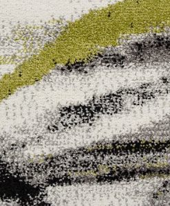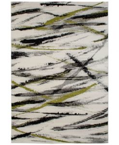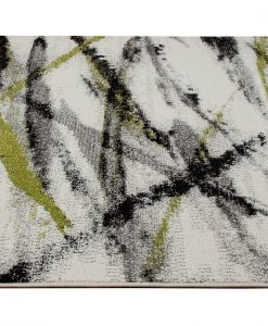Weston Abstrakt har en vit bottenfärg med matchande langettering på långsidorna. Mönstret på mattan påminner om tunna penseldrag som går i färgerna silvergrått, limegrönt och svart.